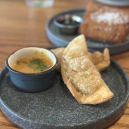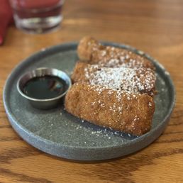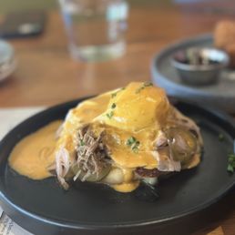 Really fun and unique breakfast spot. It is a tapas place which I enjoyed but this does mean that things come as they are ready rather than all at the same time. The portion sizes are small so you can get a bunch of things and share which makes it filling and the prices are super reasonable. Flavor combinations are unique and everything tastes so good. I think the churros were my favorite, so crispy and sugary with a great sauce. I was a little disappointed about the pork biscuit because it didn't quite match my expectations but it was delicious. The biscuit was more of a flat bread and it wasn't a sandwich because it was open faced. I think that's the challenge with fusion food, it is a little different than expected. If you can be open minded it's great. The last thing I'll say is they didn't do a great job of organizing the seating. There was a group of 3 seated at the only 6 person table but there were a ton of 4 person tables that were empty. My group of 7 had to wait for the 3 to be done before we could sit even though a ton of tables were open. I would go back for sure.