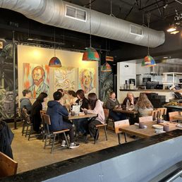 The restaurant's ambiance is described as quirky and artsy, with TV's showcasing sports games and featured artists creating art that can be purchased. The casual yet trendy atmosphere makes it a great spot for brunch, lunch, or dinner.