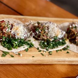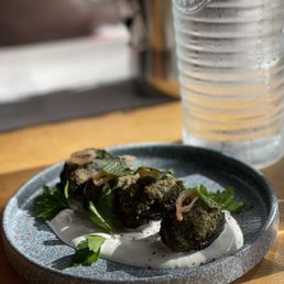 Food: Beware that menu's differ between day and night. At night, they have a 'late night menu' which is shortened menu. All food items are small tapas/shareable plate sizes. Ambiance: Nice! At the bar, the tv's are usually playing various sports games. Sometimes there is a featured artist in the corner of the restaurant creating art that can be purchased. Light music can also be heard through the restaurant. In addition to indoor seating, the restaurant does have outdoor/patio seating.